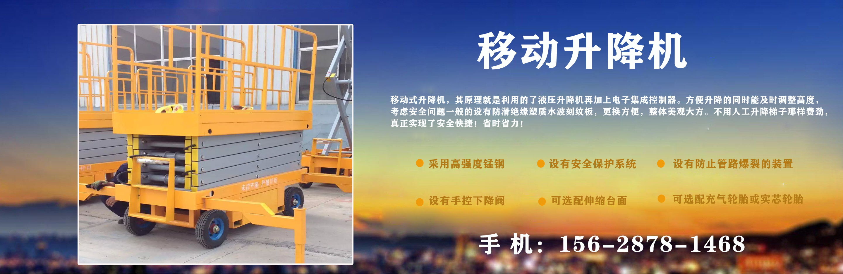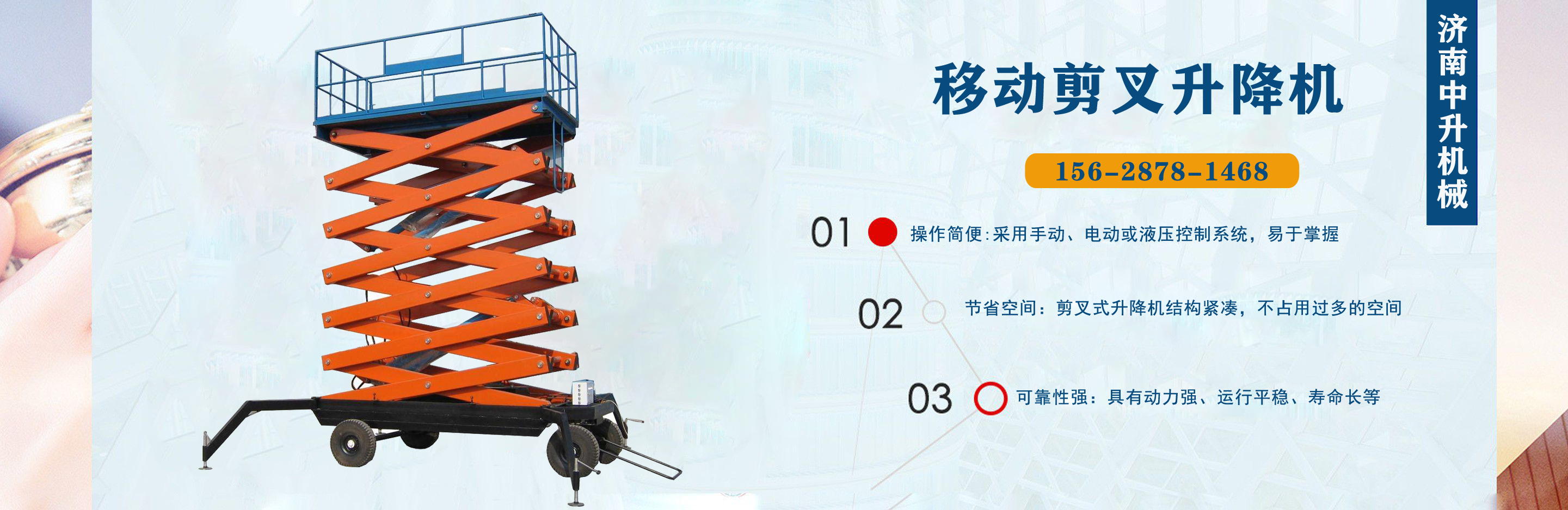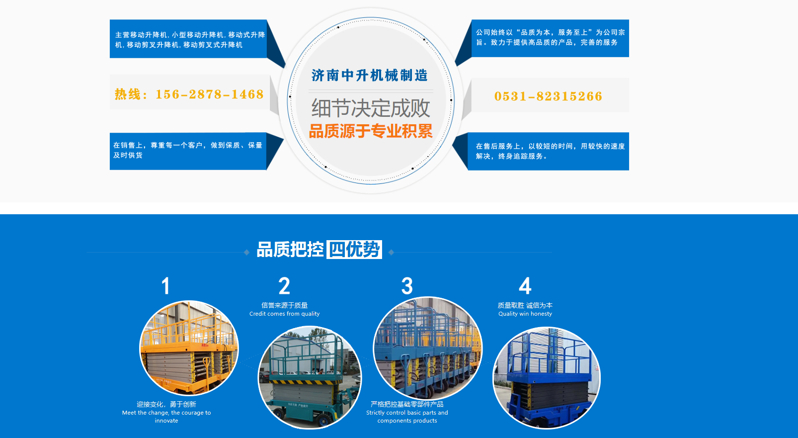 濟(jì)南中升機(jī)械制造有限公司主營移動(dòng)升降機(jī),小型移動(dòng)升降機(jī),移動(dòng)式升降機(jī),移動(dòng)剪叉升降機(jī),移動(dòng)剪叉式升降機(jī)等產(chǎn)品,信譽(yù)良好,歡迎前來咨詢訂購! 在銷售上,尊重每一個(gè)客戶,做到保質(zhì)、保量及時(shí)供貨;在售后服務(wù)上,以較短的時(shí)間,用較快的速度解決,終身追蹤服務(wù)?! 」臼冀K以“品質(zhì)為本,服務(wù)至上”為公司宗旨。致力于提供高品質(zhì)的產(chǎn)品,完善的服務(wù),快捷的供貨,無論您身處何方,都能感受到我們的優(yōu)良服務(wù)。客戶至上,誠信為本?! g迎各界朋友來電,來函垂詢,選購!...